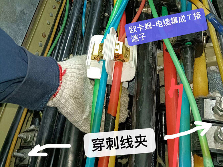 本次采用欧卡姆电缆集成T接端子替换原穿刺线夹产品,使电缆芯线不暴露,整体完整、美观大方、规范标准, 一个产品替代五个穿刺线夹,电气连接可靠、运行稳定、不刺伤电缆芯线导体,提升建筑电气安装品质。