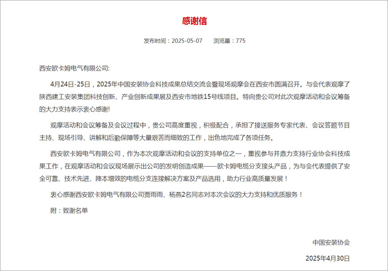近日,西安欧卡姆电气有限公司收到中国安装协会发来的感谢信,对其在“2025年中国安装协会科技成果总结交流会暨现场观摩会”中的突出贡献给予高度肯定。作为行业技术先锋,公司全程深度参与会议筹备与执行,不仅为参会专家提供接送、引导等周到服务,更在现场生动展示了自主研发的“欧卡姆电缆分支接头”产品,以安全可靠、降本增效的创新技术解决方案赢得与会代表广泛好评。